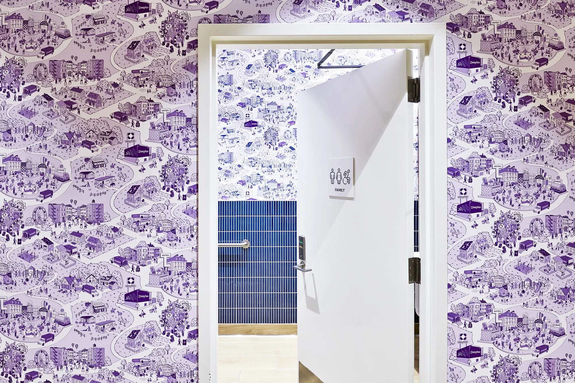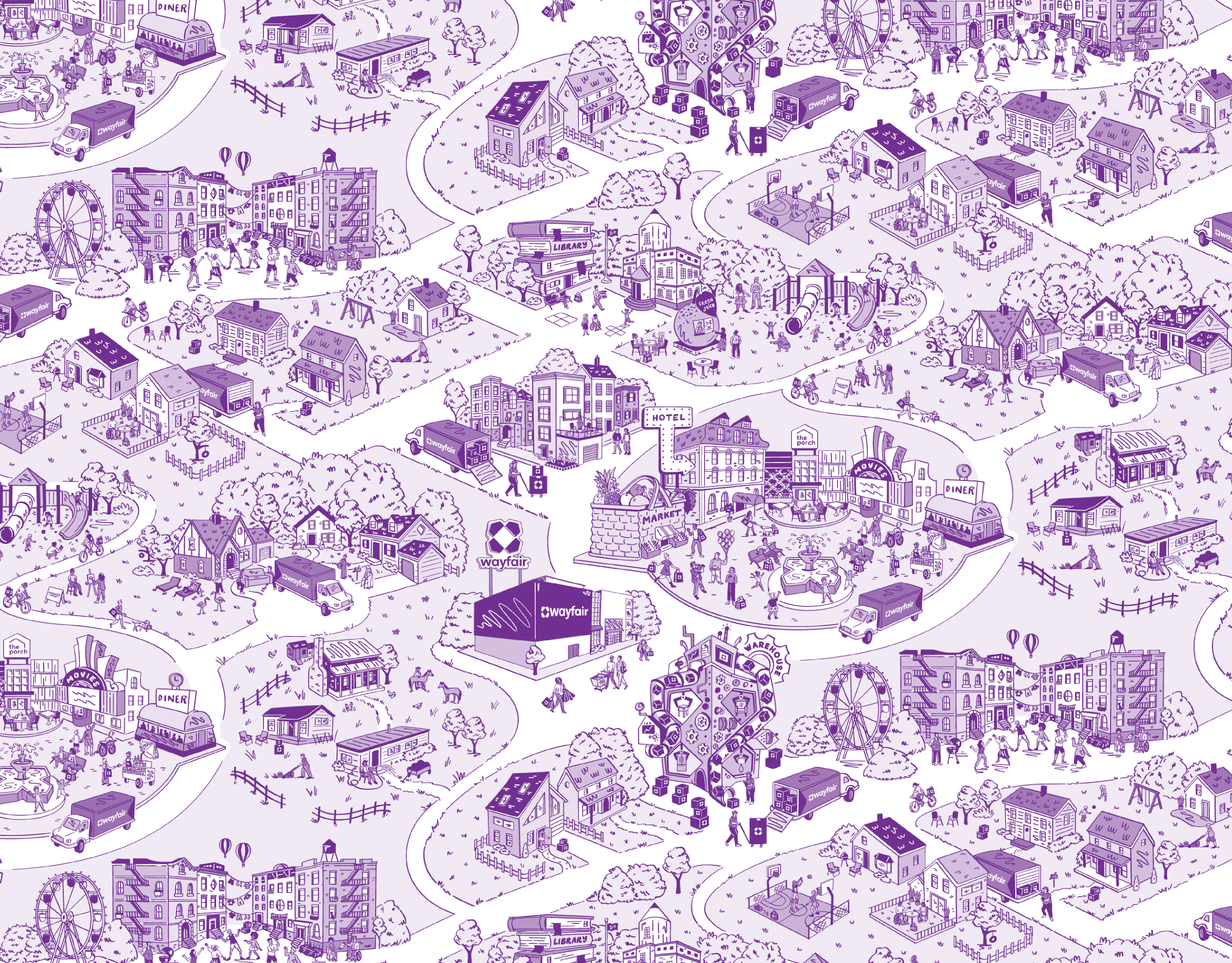 For this repeatable pattern, I art directed illustrator Julia Emiliani to create a design inspired by classic French toile. The pattern reimagines the Wayfair customer experience through whimsical, Wayfair-coded scenes—including the Wayfair store, an imaginative warehouse, a vibrant town square, and diverse neighborhoods filled with people of all kinds. This custom illustration was produced across various materials, including wallpaper, reusable bags, coffee cups, and more.